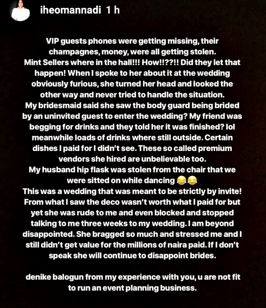 In another post on Instagram, Iheoma who revealed that due to the unprofessionalism being exhibited by the event planner, expensive phones of VIP guests were stolen the wedding, also give details of the shoddy job done by her wedding planner.