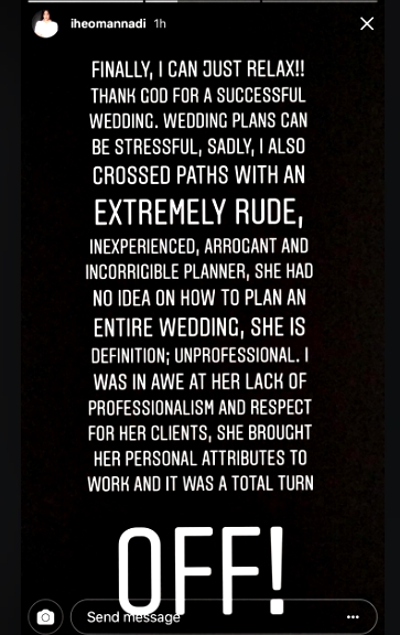 Less than 24hours after the wedding, the newly-wedded ex beauty queen, Iheoma Nnadi took to her Insta story to call out her wedding planner for ''bringing her personal attributes to work''.
